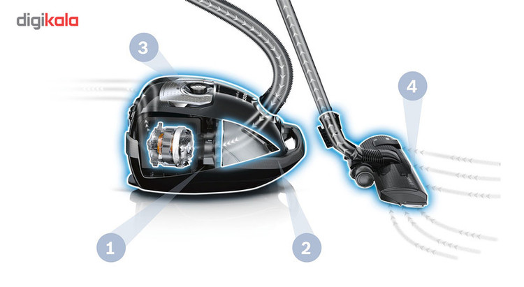 موتور جاروبرقی BGL8GOLDIR بوش بسیار قدرتمند و کم صدا میباشد و توان مصرفی آن 2200 وات است. تکنولوژیIn ‘genius Gold Edition که در این جاروبرقی تعبیه شده، یک تمیزی فوقالعاده را برای شما به ارمغان میآورد. سیستم Power Protect طراحی شده توسط شرکت سازنده با60 درصد قدرت مکش بیشتر باعث میشود تا با جریان هوای عالی، برای عملکرد تمیز کردن، شما جاروکشی پرقدرتی را داشته باشید، همچنین وجود این سیستم باعث افزایش مکش جاروبرقی در زمان نیمه پر بودن کیسه می گردد. سیستم Quattro Power عملکرد بسیار عالی در مکش دارد که باعث نتایج عالی در جارو کردن با مصرف انرژی کمتری میشود. این جاروبرقی دارای موتور کمپرسور HiSpin با تیغه های ایرودینامیک و کاملا کالیبره یکی از کم مصرف ترین جاروهای موجود در بازار است. فیلتر این جاروبرقی هپا (HEPA) میباشد که با ویژگی بالا برای عملکرد بهتر، تمام گرد و غبار را به خوبی به خود جذب می کند و مانع از پخش شدن در محیط میشوند و هوای خروجی 99 درصد بدون ذرات آلرژیزا هستند. همچنین این فیلتر قابل شستشو میباشد. پارویی این مدل جاروبرقی بوش مجهز به Air Bumper است که از ایجاد خطوط سیاه روشن روی مبلمان و از ایجاد خط و خش روی سطوح جلوگیری میکند. حجم کیسه گرد و غبار این مدل جاروبرقی 5 لیتر میباشد که این حجم باعث میشود شما ماه ها از یک کیسه استفاده کنید و در هزینه خرید مداوم کیسه صرفهجویی کنید. پاکت مصرفی این مدل جاروبرقی بوش تیپ G میباشد. وجود 5 عدد کیسه اضافی داخل جعبه دستگاه و برخورداری از شلنگ کنفی از دیگر مزایای این جاروبرقی بشمار میآید. لوازم جانبی همراه جاروبرقی شامل 3 ابزار حرفهای میباشد که شامل برس اثاثیه، برس بسیار بلند درزها و برس سری حرفهای که مجهز به سیستم Silence Sound است که باعث عملکرد بیصدا و آرام میباشد. لوله خرطومی این جاروبرقی بسیار باکیفیت است و به راحتی پاره نمی شود و تغییر شکل نمیدهد. این جاروبرقی بوش با دارا بودن لوله پلاستیکی تلسکوپی خود مناسب هر کاربری میباشد زیرا میتواند به راحتی لوله جاروبرقی را بلند و کوتاه کند. دسته این مدل جاروبرقی ارگونومیک میباشد که باعث سهولت در استفاده از آن میشود.